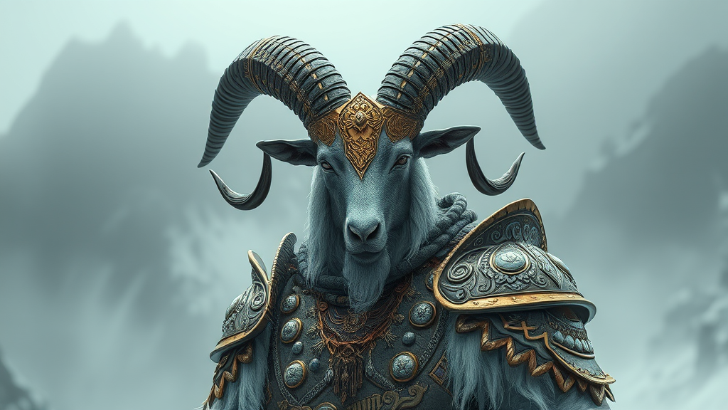 Ethereal goat knight adorned in opulent Norse armor, exuding an air of formidable majesty, exquisitely detailed with elaborate and intricate designs, embodying a hypermaximalist style with luxurious, elite adornments. The presence is both ominous and haunting, evoking a sense of ancient lore. Rendered in a grand matte painting style, with sweeping cinematic flair reminiscent of the works of cgsociety. Inspired by the fantastical elegance of James Jean and Brian Froud, blended with the dynamic vibrancy of Ross Tran.
