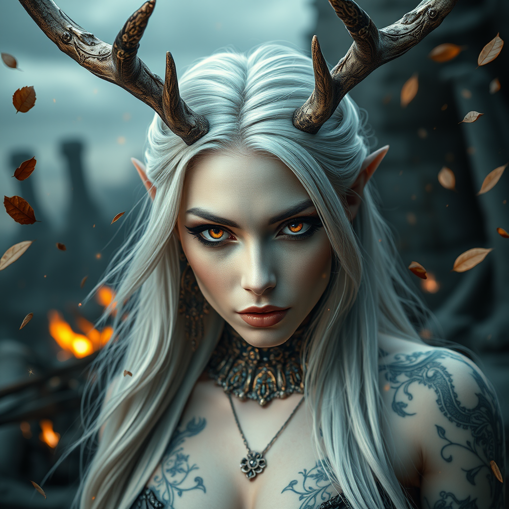 Ethereal goddess, captivating and enchanting, with a provocative allure, adorned with elegant deer antlers and a radiant aura. Her white hair cascades over porcelain skin, a fierce and intense presence emanating from within. This enigmatic demoness is embellished with intricate tattoos and ornate jewelry that glint in 4k resolution. Luminous particles dance in the air, mingling with falling leaves, set against an apocalyptic backdrop of ruins. Her mesmerizing eyes, vivid and detailed, draw you in, highlighted by flickering fire embers. A masterpiece of art and illustration come to life, with volumetric lighting accentuating her mystic allure. This realistic and stunning model could be a character from an epic game or a haunting photograph taken in a world of fantasy. Inspired by the artistry of Sophie Anderson and Artgerm, she is a striking portrait of beauty and strength in a breathtaking scene.