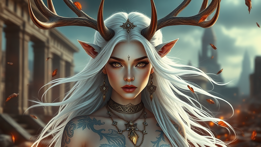 Ethereal goddess with striking deer antlers, exuding a captivating aura. Her flowing white hair frames her pale, flawless skin. A hint of ferocity underscores her beauty, an enigmatic blend of angelic and demonic allure. Intricate tattoos and delicate ornaments adorn her, complementing the elegant jewelry that catches the light. Her piercing, mesmerizing eyes seem alive, detailed and radiant amidst swirling fire particles and drifting leaves. Set against an apocalyptic backdrop of ancient ruins, she captures a sense of otherworldly mystique. This character, inspired by the likes of Sophie Anderson and Artgerm, is brought to life with stunning detail and realism, enveloped in soft, volumetric light that casts enchanting shadows. The scene is vibrant with glowing lights, creating a dynamic game character that feels both realistic and dreamlike.