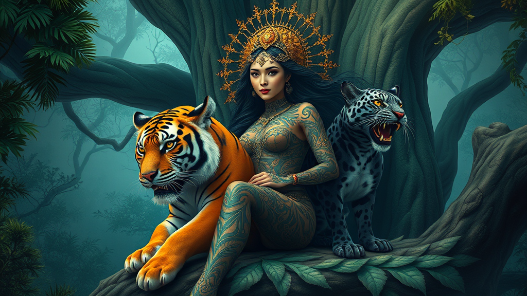 Ethereal Ω goddess with tigress and panther, intricate tattooed visage, on magnificent tree throne, vibrant foliage, dramatic spotlight, mystic jungle essence, enigmatic character portrait