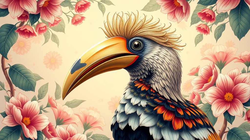 Ethereal Hornbill, 8k, buceros, showcasing intricate details and ornate features, set against a bright, flowery background. The scene exudes peace and is crafted as a detailed illustration in an octane render style. Inspired by the elegance of Johanna Rupprecht and the classic patterns of William Morris, with a touch of trending art aesthetics from ArtStation, the composition is designed in a 16:9 aspect ratio. The Hornbill is gracefully integrated into the scene, its feathers glistening with vibrant colors, creating a harmonious and serene atmosphere.