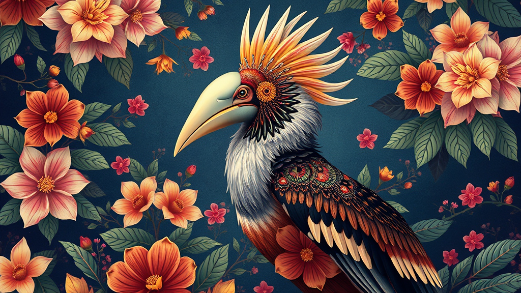 Ethereal Hornbill, buceros, 8k :: exquisitely detailed, adorned, floral motifs, vibrant colorful backdrop, serene ambiance, intricate illustration, rendered in octane style :: reminiscent of Johanna Rupprecht's artistry, inspired by William Morris patterns :: popular on artstation, 16:9 aspect ratio, with slight creative twists.
