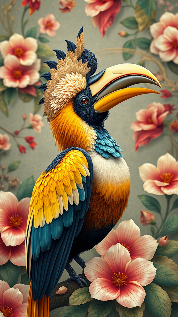 Ethereal hornbill, buceros depicted in intricate detail and ornate design, set against a flowery and vibrant colorful background, embodying peace. This detailed illustration employs the octane render technique, drawing inspiration from Johanna Rupprecht and William Morris styles, capturing the elegance and beauty of the subject. The artwork is designed to be trending on ArtStation, presented in a 16:9 aspect ratio.