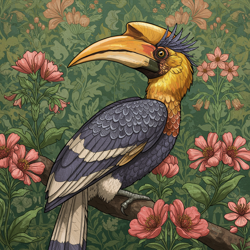 Ethereal Hornbill in a vibrant natural setting, 8k resolution, buceros with intricate details, ornate plumage, surrounded by a flowery and colorful backdrop, exuding peace. The illustration is detailed and reminiscent of an octane render. Influenced by the artistic styles of Johanna Rupprecht and William Morris, creating a harmonious blend. Captivating and trending on art platforms like ArtStation. Aspect ratio 16:9.