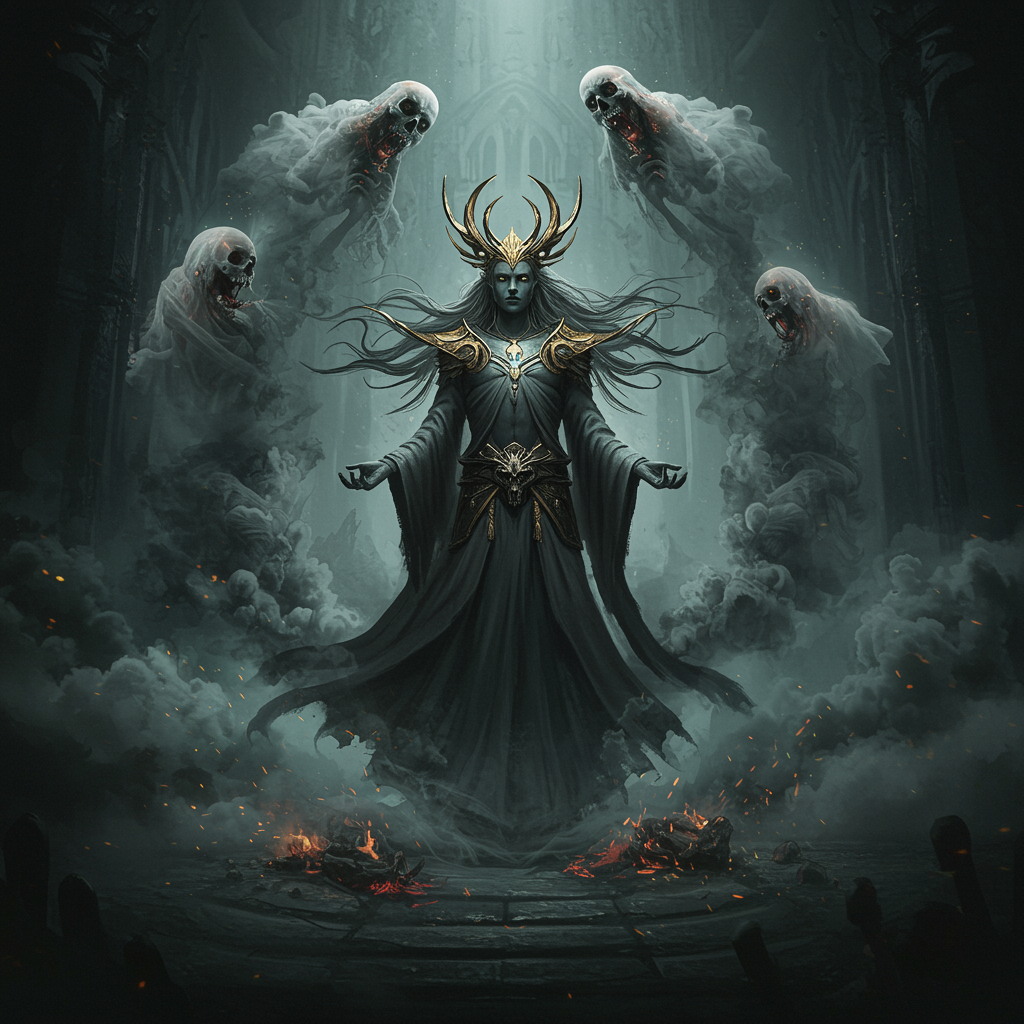 Ethereal hyper-maximalist composition featuring a regal figure enveloped in complexity, their long hair and flowing garments caught in a wind that feels ancient and mystical. This figure, reminiscent of something out of Magic the Gathering, stands with vibrant contrast, surrounded by swirling clouds of toxic fumes and smoke that form a spiral of specters within the vast expanse of a colossal dark castle. Influenced by the haunting intricacies of Massimo Caggese and the surrealism of Moebius, the scene boasts a gorgeous, statuesque pose, akin to high-caliber ArtStation and Unreal Engine craftsmanship. Dramatic lighting casts deep, expressive shadows, intertwining with orthodox symbolism woven into the scene. It's a masterclass in concept art that blends tribal dark fantasy with touches of magic realism, ambient occlusion lending depth, while emotive, volumetric lighting heightens the atmosphere. The entire piece is envisioned in stunning 8k resolution, capturing every detail down to the whisper of air and shadow, conveying a timeless potency.