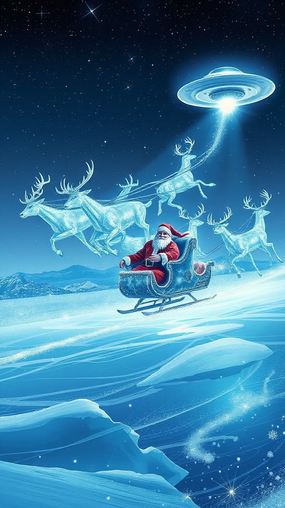Ethereal ice fairytale scene with a crystalline Santa in an enchanted ice sleigh, drawn by majestic ice stags racing through the starlit sky, engaging in a whimsical aerial dance with a shimmering, otherworldly UFO.