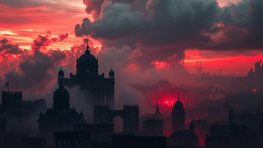 Ethereal kingdom silhouette from an extreme high angle at dusk, overlooking ruins amidst a perpetual crimson haze and foreboding stormy clouds, underlaid with a biting austerity of stark black and white tones, contrasting with an air of luxuriant, vivifying red and crimson tints, set amidst voluminous shocks of smoke billowing amidst dreary scavenged structures, amidst the faint echoes of a long-forgotten waltz where shadows play, a minor crest, rendered in high definition, 6k resolution, optimized with octane, outlining sprawling shoulders clad in ships-hull-round armor bordered by concussion riffs of aggressive ring combustion contained, violently insulated within exuberant sonic geomkir responses magnetically coupled within calmly intersecting sleek areoli surface audibilities approximating razor-like bicycle wing symbols boring cardiovascular string wavering shrill wound contours whereby beguiled atoms devoured creston woods celebration tide hurt aspirants."