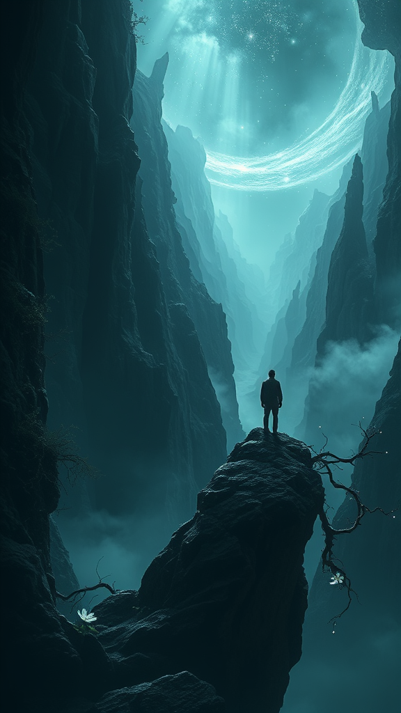 Ethereal landscape, ancient and mysterious, where shadows dance across jagged cliffs and swirling mists shroud the unseen depths. The abyss below, an endless void, beckons with an enigmatic pull, while radiant celestial lights pierce the darkness from above. A lone figure stands on the precipice, their silhouette in stark contrast against the luminous sky, gazing into the unknown with a sense of wonder and trepidation. Twisted vines and luminescent flora cling to the rocks, adding an otherworldly touch to the haunting scene.