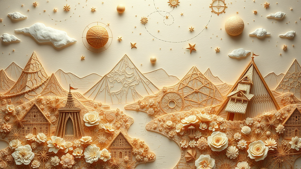 Ethereal landscapes crafted from intricate paper cutouts and quilled details, inspired by ancient cartographers' mystical maps, infused with delicate floral patterns and celestial bodies, rendered in exquisite 8k resolution, with an emphasis on realistic textures and subtle shading to evoke a sense of nostalgia and wonder