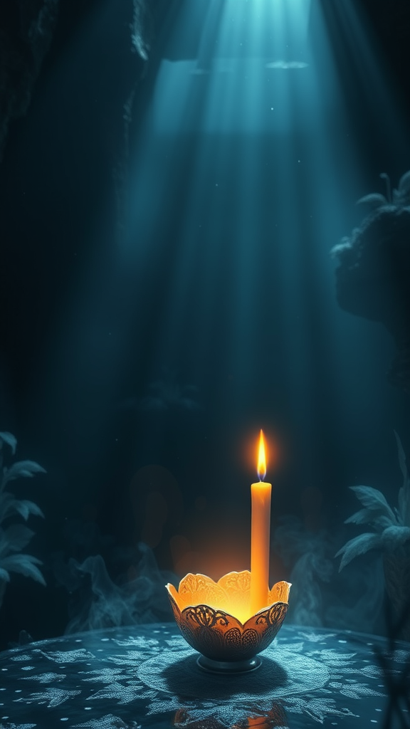Ethereal luminescence of a candle casting gentle light in shadowy realms, dreamlike and hyperreal, art masterpiece in the style of Artgerm, meticulously detailed with intricate patterns, celestial ambiance, digital art wonder, overflowing with details, visionary concept art, harmonizing colors, capturing attention on artstation and cgstudio, unparalleled beauty in imagery, strikingly dramatic yet elegantly subtle, award-worthy depiction, mesmerizing scenery, powered by unreal engine, rendered in 8k, breathtaking vertical aspect ratio.