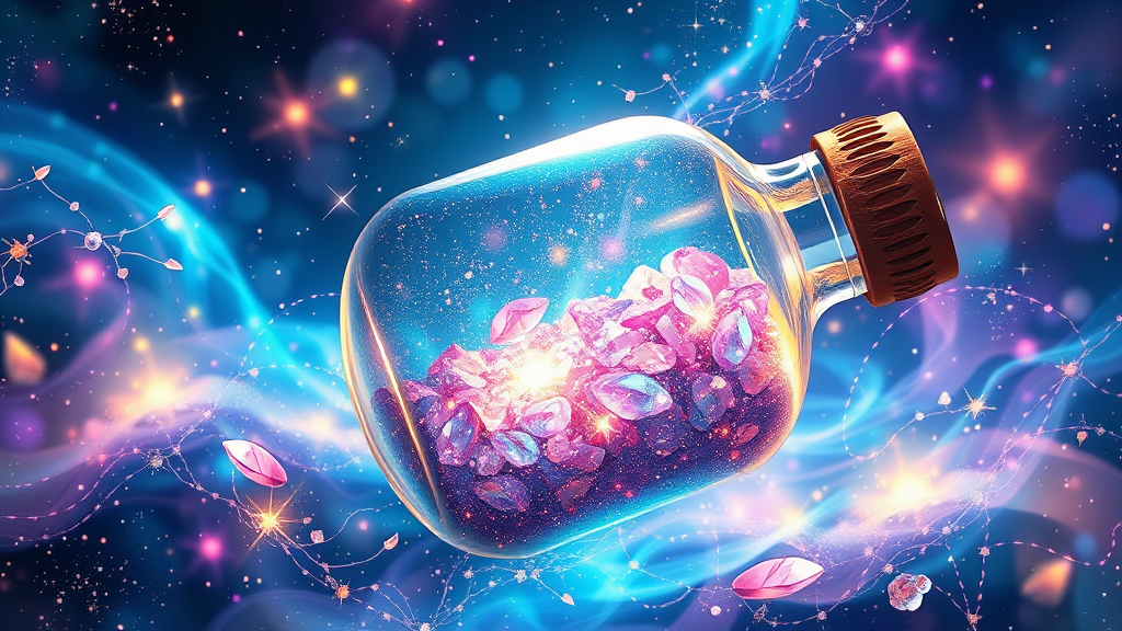 Ethereal magical fairy dust captured in a crystal bottle emanating cosmic mystical energy, highly detailed illustration, vivid colors, enchanting, elaborate design, harmonious color scheme, fantasy concept art, popular on Artstation with Unreal Engine 5, by artist inspired by "anime" aesthetic, Anime Key Visual style, Japanese Manga influence, featured on Pixiv, Zerochan, Anime art style, Fantia, Hyperrealistic appearance, vibrant splash art, conceptual artistry, mid shot focus, intricately detailed craftsmanship, rich color depth, dramatic lighting, 2/3 face angle emphasis, side lighting highlights, vibrant backdrop, created using SAI Pixel Art techniques.