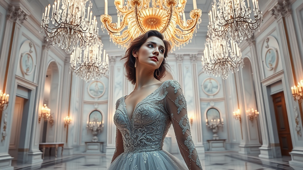 Ethereal opera singer in beaded Seraglietto gown, surrounded by lavish crystal chandeliers, set against the regal backdrop of a majestic white Carrara marble ballroom, illuminated by razor-sharp volumetric lighting with delicate halo effects, painted in the grand style of a 20th-century Old Master, with refined subtleties of sfumato and chiaroscuro, reminiscent of Bertoldo or Giulio Romano, hyperrealistically depicted with almost palpable textures, glows, and luminescence, matched by the rich, jewel-toned palette of a winter sky at sunset, reimagined by iconic designer Elsa Schiaparelli, in the high-glamour tradition of Henry Clarke, Alexander Liberman, and Irving Penn, with personal input from legendary portrait artist, Julie Maintigneul Belleville, retouched for opulence and drama by award-winning artist, Prabhu Martha, using high-dynamic range color correction software, and photographed by celebrated photographer, Joy Gregory, with a Hasselblad H6D-100c camera, a Carl Zeiss Otus 50mm f/1.4 APO Distagon, 1/320 shutter speed, ISO 64, in procession, first enlargement, printing surface, on 300gsm matte paper, in editions limited to 50.