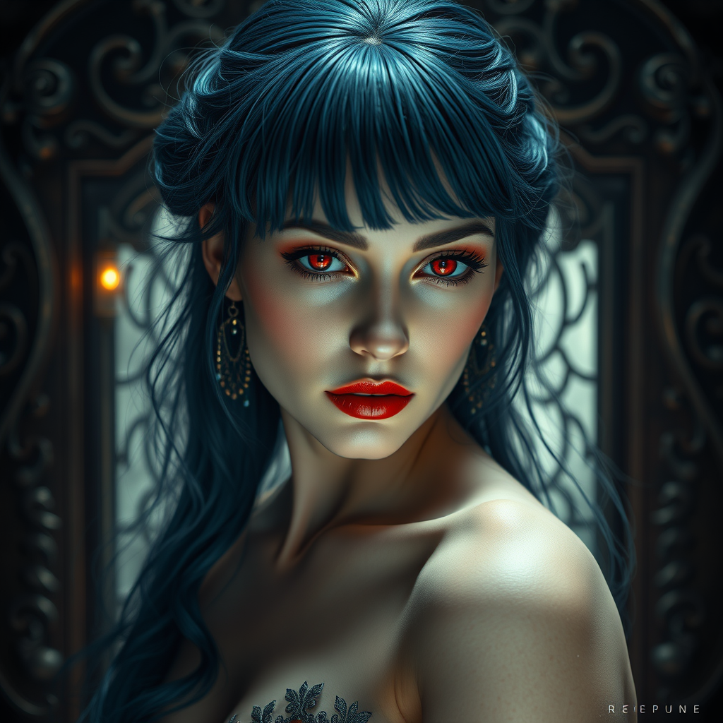 Ethereal pale-skinned women with deep blue tresses and striking crimson eyes, embodying an enchanting allure and regal vampiress essence; a blend of darkness and morbid elegance, set within a dense, atmospheric gothic scene. Captured in a glamourous shot, she exudes a seductive femme fatale charisma, her glistening skin under an intricate, ornate backdrop. Passionate and intensely detailed, this photorealistic full-body depiction uses octane render techniques to enhance a maximum landscape, with volumetric lighting casting a dramatic, immersive aura around her timeless beauty.