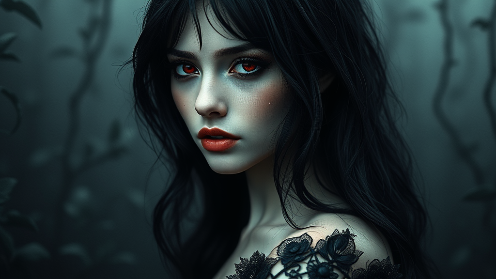 Ethereal pale-skinned women with deep navy hair, piercing scarlet eyes, exuding an irresistible charm, captivating and regal in her vampiric allure, shrouded in a somber, gothic ambiance. Her moist surroundings are thick and atmospheric, embracing an epic and dramatic aura with an unsettling yet mesmerizing beauty. She embodies a delicate yet ornate femme fatale, captured in a glamour shot that is both fervent and intricately detailed. The scene is incredibly lifelike, emphasizing expansive and vivid landscape details, showcasing a full-body portrayal rendered with octane precision, enhanced by photorealistic, volumetric lighting.