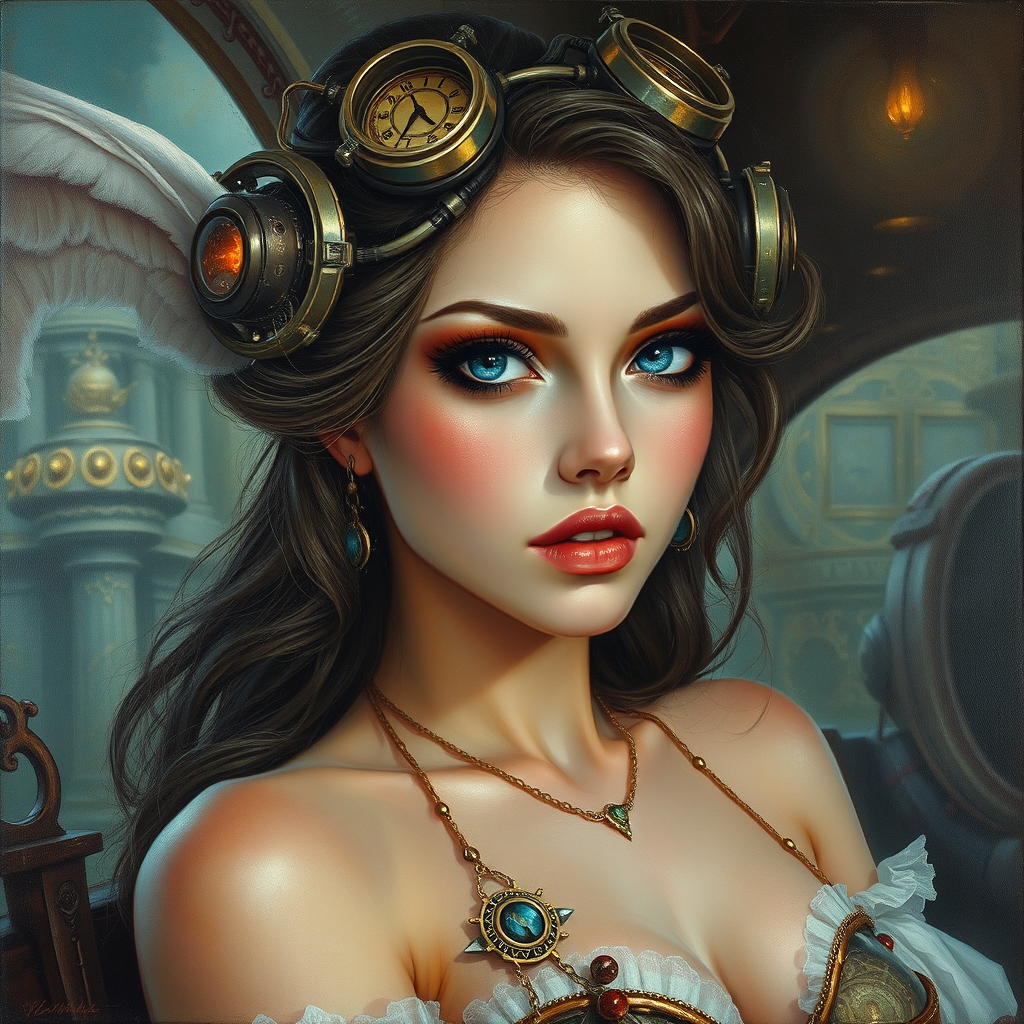 Ethereal pin-up in a sci-fi steampunk setting, exceptionally detailed and realistic, evoking the style of a master figurative painter; an exquisite oil painting on canvas with intricate details capturing a blend of elegance and fantasy, reminiscent of Daniel F Gerhartz's beautiful artistry, with intentional yet subtle imperfections adding a whimsical and surreal touch.