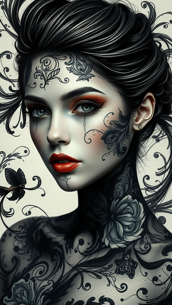 Ethereal portrait of a striking woman adorned with intricate black tattoos, surrounded by swirling patterns of ink that create a sense of fluid motion, reminiscent of a gouache painting. The image showcases exceptional detail and mastery in capturing the essence of beauty, akin to the works of Aaron Horkey and Jeremy Mann. Natural and volumetric lighting cast a soft glow over her features, enhancing the photorealistic quality. This 8k resolution piece is a maximalist feast for the eyes, combining complex and elegant elements that evoke a sense of fantasy. The composition is perfectly framed and polished, ensuring the proportions and anatomy are flawless, resulting in a captivating visual masterpiece.
