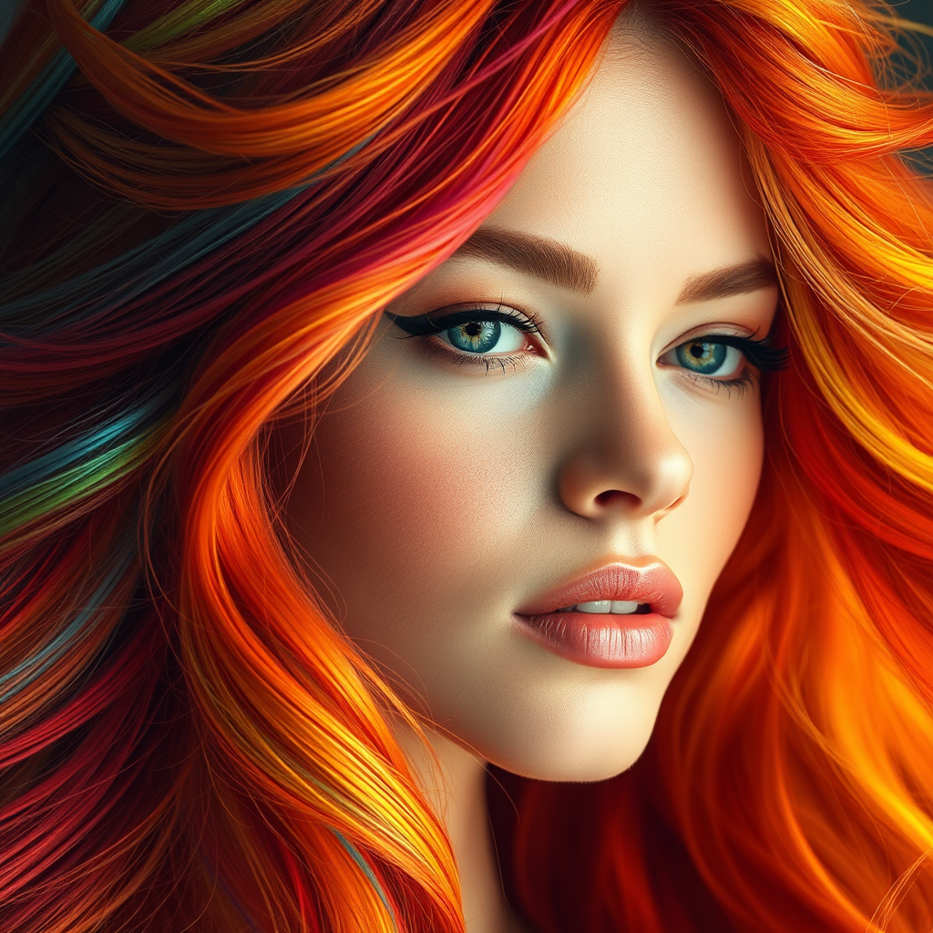 Ethereal portrait of a stunning and elegant woman, her face framed by cascading waves of fiery, multi-hued hair interwoven with shimmering rainbow tones. Her locks seem to flicker with a burning intensity, complementing her radiant, glowing skin. The captivating colors blend seamlessly, creating an enchanting and vibrant visual harmony.