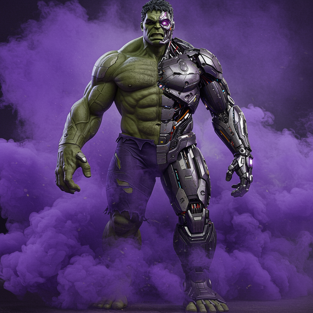 Ethereal purple smoke swirls around a towering, giant figure, its muscular body a mesmerizing fusion of raw power and advanced robotics, complete with intricate metal enhancements glistening in the light. The half-robotic Hulk stands majestic in stunning 4k detail, each sinew and cybernetic component harmoniously blending in an awe-inspiring display of futuristic might.