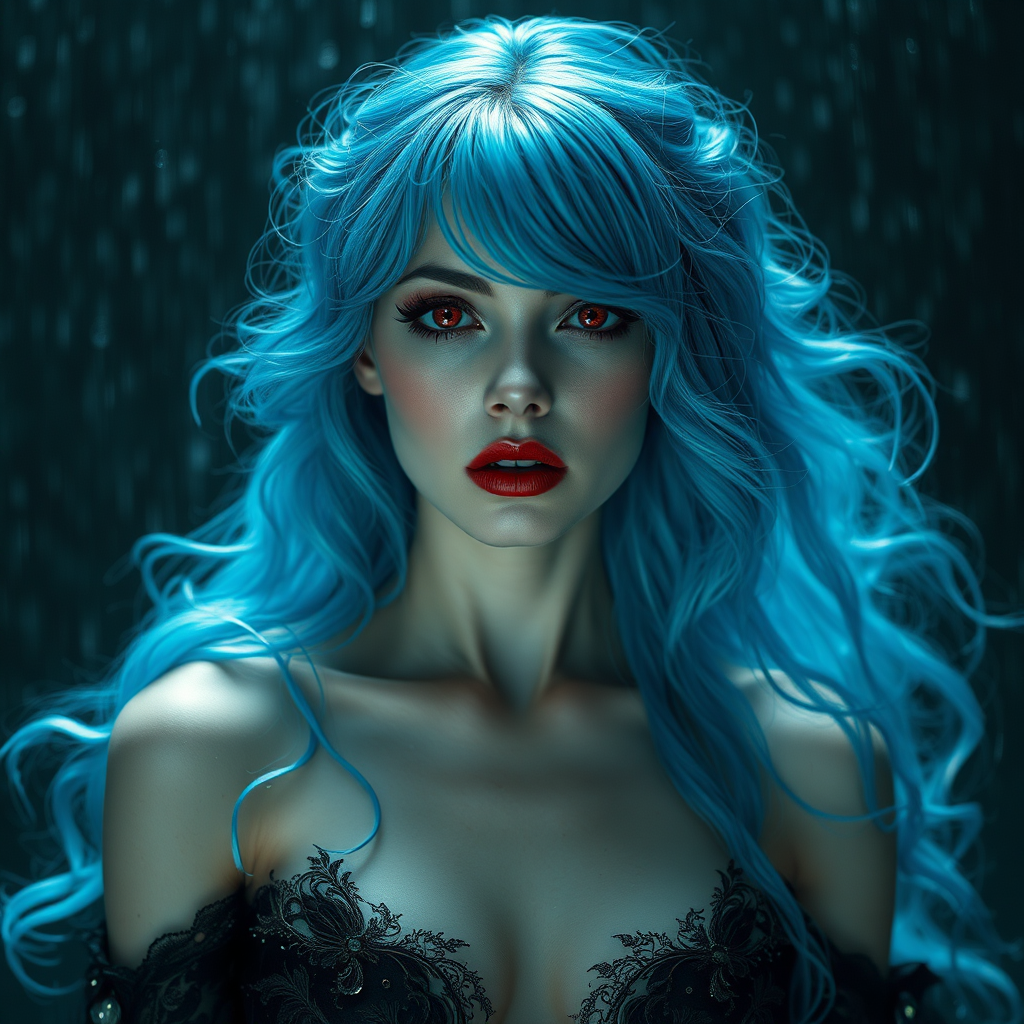 Ethereal siren with porcelain skin, azure blue hair cascading in waves, and piercing scarlet eyes, embodying the essence of a seductive and captivating queen vampiress. Enveloped in an atmosphere of dark and gothic beauty, her presence is both morbid and magnetic, exuding an aura of authority and enigma. Under the sheen of dampness, the environment is rich and immersive, with epic and dramatic undertones. Her figure glistens with a haunting allure, embodying the essence of a femme fatale in a glamour shot of unparalleled passion. The scene is incredibly detailed, showcasing a full-body view rendered with breathtaking realism, enhanced by volumetric lighting and intricate landscape elements, creating a captivating and surreal visual with cinematic intensity.