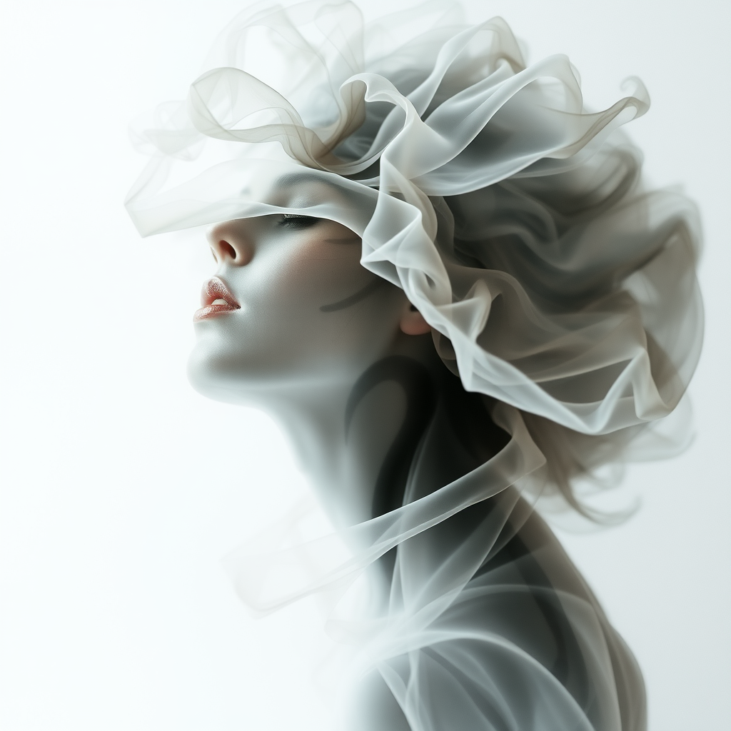 Ethereal smoke sculpture portrait of a woman, reminiscent of flowing silk fabrics, delicate ink washes, and the grace of dance, inspired by the intricate styles of Juliana Nan and Mandy Disher, capturing movement and spontaneity with clarity and precision, where the essence of elegance is expressed through soft, translucent forms and subtle gradients, evoking a mesmerizing sense of fluidity and grace.