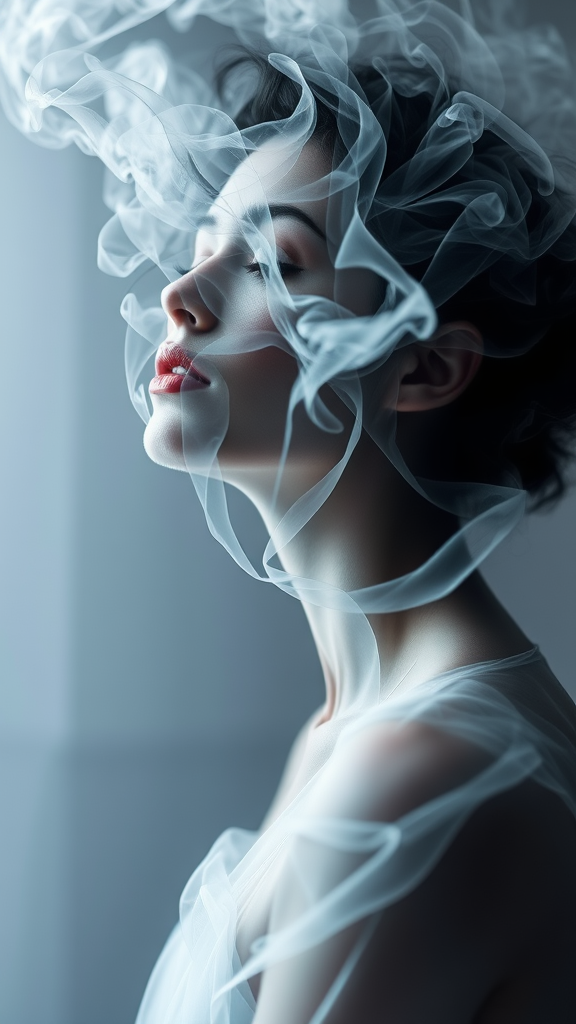 Ethereal smoke sculpture portrait of a woman, reminiscent of graceful flowing fabrics and delicate ink washes, infused with the essence of dance, inspired by the artistry of Juliana Nan and the clarity of Mandy Disher, capturing a fluid sense of movement and spontaneity with a touch of whimsy, maintaining a refined and vibrant portrayal.