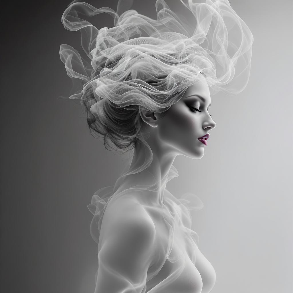Ethereal smoke sculpture portrait of a woman, reminiscent of fluid fabrics and delicate ink washes, exuding the grace of dance, inspired by the elegance of Juliana Nan, with the clarity and precision of Mandy Disher's work, capturing dynamic movement and spontaneous essence, set in an elongated aspect ratio with high stylization.