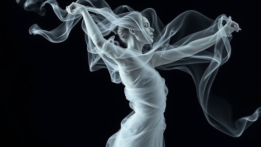 Ethereal smoke sculpture portrait of a woman, resembling flowing silk fabrics, with delicate ink-like washes; capturing the grace of dance and the artistry of juliana nan. Inspired by crisp clarity and the spontaneous movement seen in mandy disher's work, this portrayal embodies elegance and fluidity --ar 73:106 --stylize 750 --v 5.2.