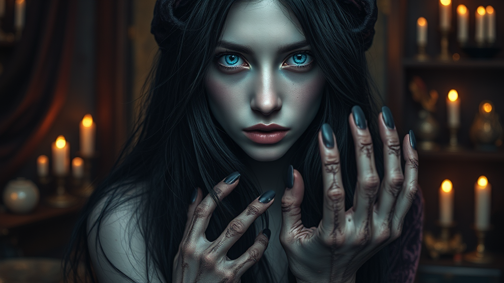Ethereal sorceress draped in tattered velvet, long black hair cascading down her back like a waterfall of night, intense blue eyes duplicated above her normal ones, as if by sorcery, amidst a hushed, candle-lit, medieval boudoir, anachronistic artifacts scattered about, gleaming with an otherworldly sheen, delicate, almost translucent skin, face frozen in a mix of concentration and mystified unease, juxtaposed with her mutated, deformed hands, fingers elongated like twigs, offset at awkward angles, hands that seem to blur and resolve before one's very eyes, an ultra-resolution snapshot of a fleeting, mystical moment, subject to distortion and disquieting artifacts, giving it the textured, nostalgic feel of a low-resolution jpeg from yesteryear, refracting reality through a PGH200 permanent image pit marker filter, optics particle gates edge and soul sowed cloth cin vign shady getContentPane