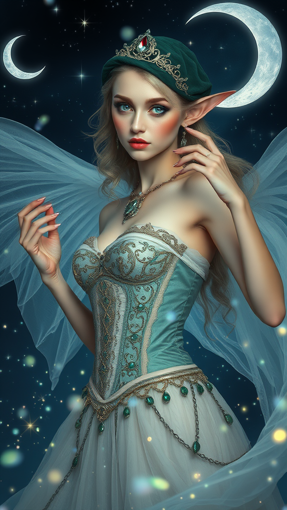 Ethereal sorceress elf maiden, midnight sky adorned with delicate silver crescent moons, intricate corsetry and layered gossamer gowns, softly luminous skin, delicate claws and piercing emerald eyes, sweeping velvet cap and delicate tiara, effulgent gown fragments caught in ethereal field of sparkling stars, ornaments and gemstones reminiscent of Rococo era luxury, shot in 8K with subtle bokeh and piercing focus effect, mdjrny-v4 style art station filtration reminiscent of Alphonse Mucha and Greg 'Serpentwind' Lutkowski's inspired works, mythical elegance unmarred by mundane imperfection, every demanded nuance rendered divine.