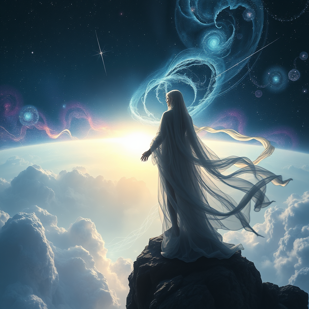 Ethereal vision of the void, a figure stands on the precipice of the unknown, bathed in shimmering shadows and luminescent hues. Their eyes, deep pools of mystery, peer into the eternal abyss, where galaxies swirl and cosmic tendrils weave intricate patterns of light. The air hums with an ancient energy, whispering secrets of unfathomable depths, while celestial winds rustle through flowing garments that merge seamlessly with the starlit sky. Time appears suspended, as though the universe itself pauses to acknowledge the profound gaze into the enigmatic chasm.