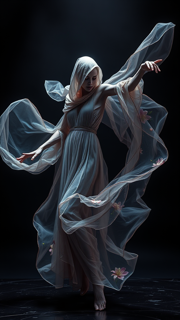 Ethereal wraith with skin like iridescent oil slicks, drifting in slow motion while assuming a pose mid-performance, with an otherworldly harmonious blend of full body, fluid dance movements, and intricate clumsy poses in a dark leathery bound tome backdrop, Tesla-like cloak with submerged floral designs spreading like ripples across the background, portal-like eyes locked onto an illegal concoction within a lead-stoppered toxin-ridden bottle; background altered to represent a fetishistic neural network base composed of theta-waves, psychological construct embedded dark seeded harbour.