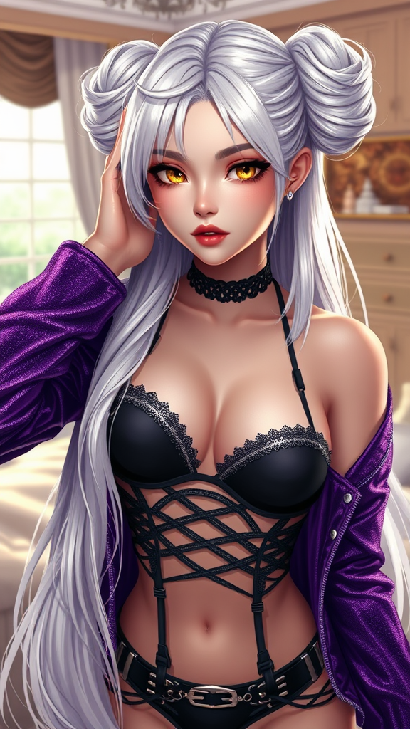 EvelynnAO, 1girl, 3d render, glamorous makeup, hair styled in playful buns, striking yellow eyes, elegant black lingerie, cozy bedroom setting, flowing white hair, stylish choker, cascading long hair, shimmering purple jacket, artistic touch, intricate garter belts, bright white sclera, chic hoop earrings, mesmerizing snake-like eyes.