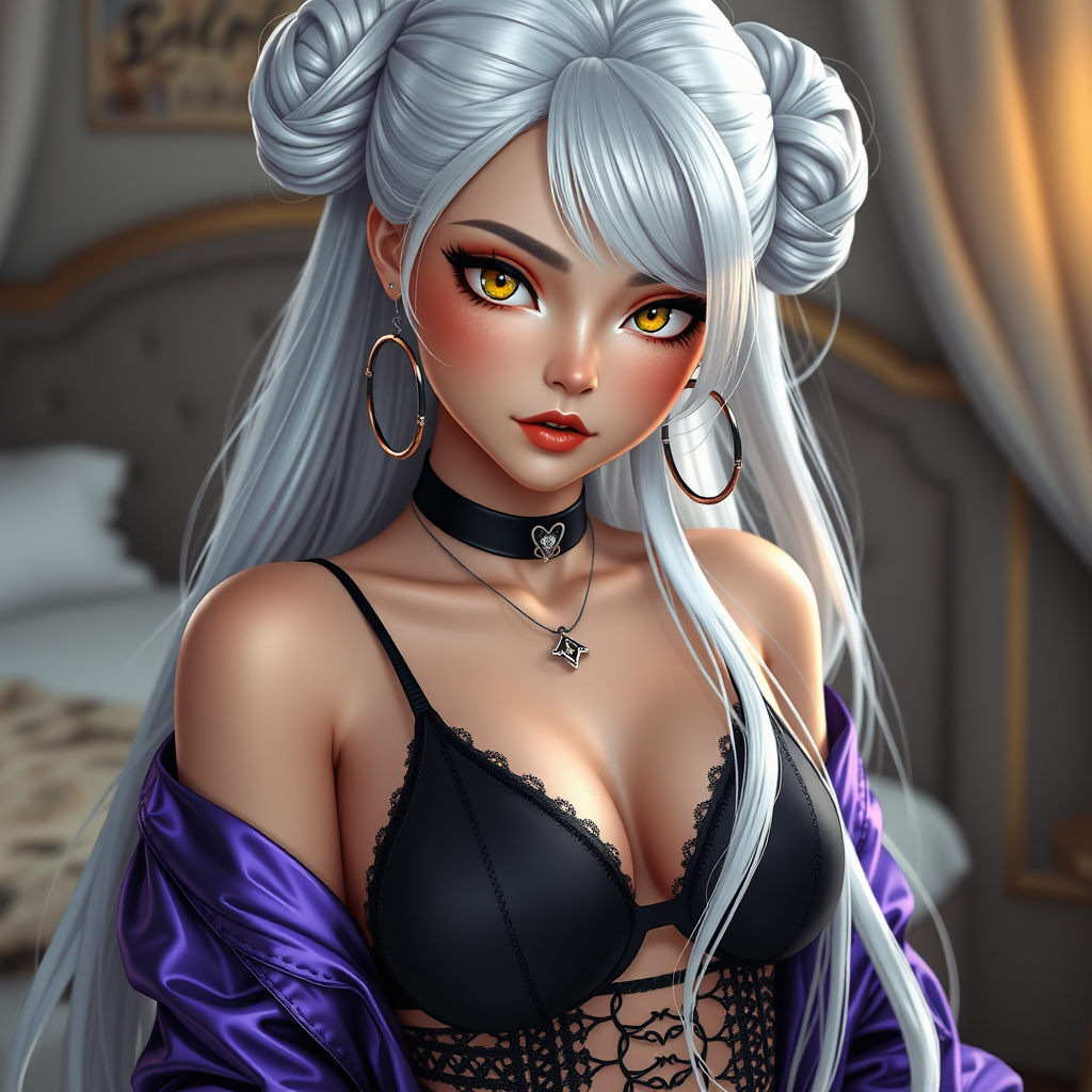EvelynnAO, 1girl, highly detailed 3d render, alluring makeup, elegant hair buns, captivating yellow eyes, sleek black lingerie, intimate bedroom setting, striking white hair, stylish choker, flowing long hair, iridescent purple jacket, artful composition, sophisticated garter belts, pristine white sclera, elegant hoop earrings, mesmerizing snake-like eyes.