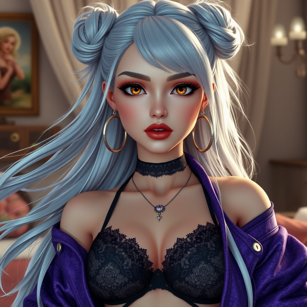 EvelynnAO character, young woman, realistic 3D render, elegant makeup, stylish hair buns, striking amber eyes, dark lace lingerie, cozy bedroom setting, flowing silver hair, delicate choker, cascading long locks, shimmering violet jacket, artistic masterpiece, alluring garter belts, bright white eyes, bold hoop earrings, captivating serpent-like eyes.
