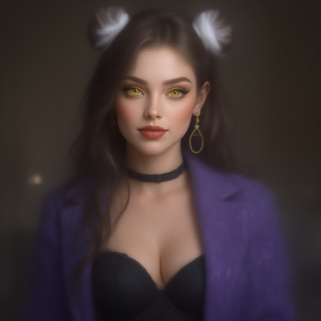 EvelynnAO inspired character, a single female figure, depicted in a realistic 3D render style, featuring intricately applied makeup emphasizing her striking yellow snake-like eyes and captivating white sclera. Her hair is styled in elegant white hair buns, cascading into long flowing locks. She is adorned in alluring black lingerie accentuated by delicate garter belts, complemented by a stylish choker around her neck. The figure is set in an intimate bedroom setting, wearing a shimmering purple opalescent jacket that catches the light beautifully. Subtle touches of uniqueness include hoop earrings that dangle elegantly, enhancing her poised and enigmatic appearance.
