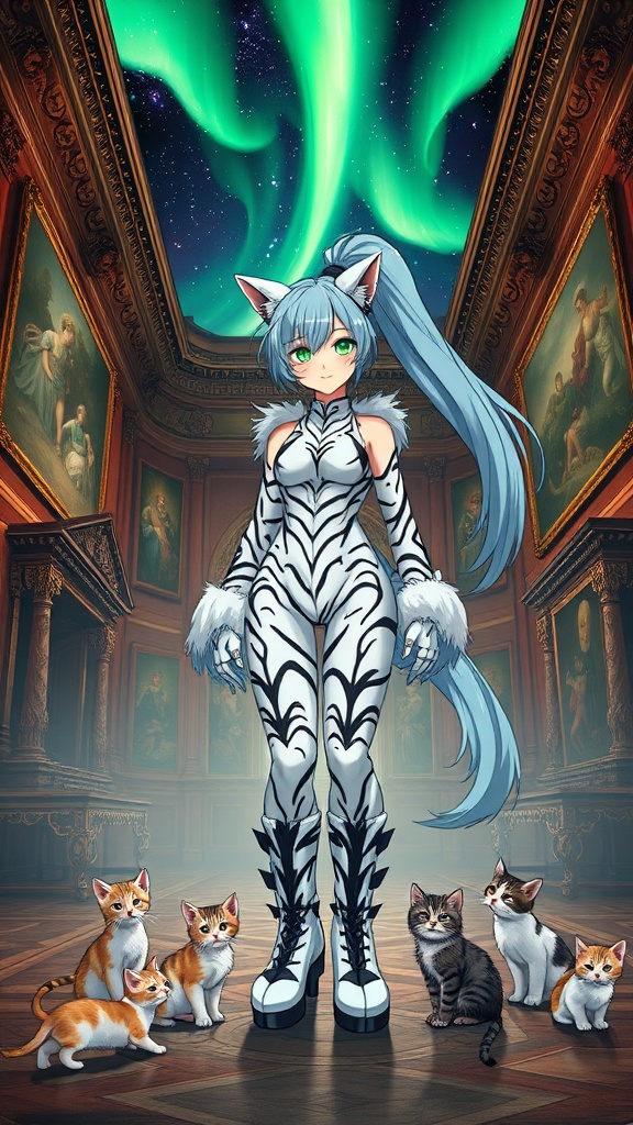 Evergarden, a girl in a full body open furry costume with a white-black tiger print, her feet wrapped in knee-high platform stiletto boots, stands confidently. Her bright green, tiger-like eyes hold a mysterious allure. She sports an extra-long, flowing platinum blue ponytail. Surrounded by playful kittens, her presence is soft yet striking in the grand hall of an old mansion, adorned with ancient paintings. Above, the breathtaking northern lights dance across the night sky, casting a mystical glow over the scene.