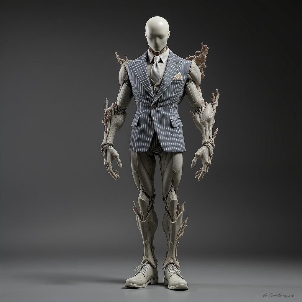 Every detail of the creation has been intricately designed, from the delicate lines of the pinstripe suit to the elaborate stitching on the shoes. The meticulous attention to detail is unmatched, culminating in a stunning masterpiece that evokes awe and admiration in all who experience it. CGI, 3D, doll, octane, render, intentional imperfections, textural elements, abstract positioning, experimental composition, dynamic aesthetics, surreal forms, imaginative structures, stylized anatomy, creative distortions, conceptual art, abstract proportions, artistic variations, unique hands, elongated figures, innovative proportions, imaginative limbs, fused concepts, reimagined silhouettes.