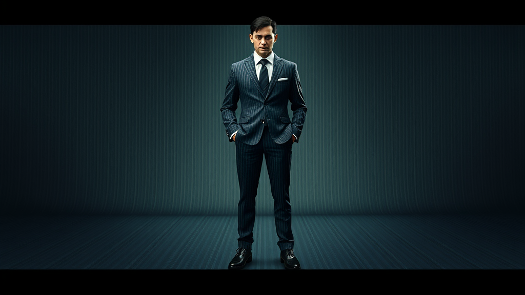Every element of the artwork has been meticulously crafted, from the fine lines of the pinstripe suit to the intricate stitching on the shoes. The attention to detail is unparalleled, resulting in a breathtaking masterpiece that inspires awe and admiration in all who behold it. This cgi 3D render captures the essence of artistic precision, blending the depth of textures and the subtle play of light and shadows to create a piece that is both realistic and ethereal. Despite its realistic appearance, subtle artistic modifications lend a touch of the surreal, where each pixel tells a story and every shadow adds depth. The figure dressed in a sharply tailored suit is poised with elegance, standing as a testament to the artist's dedication to craft. Yet, beneath the perfection, lies a hint of abstraction—a gentle reminder of the imaginative world from which this creation springs.