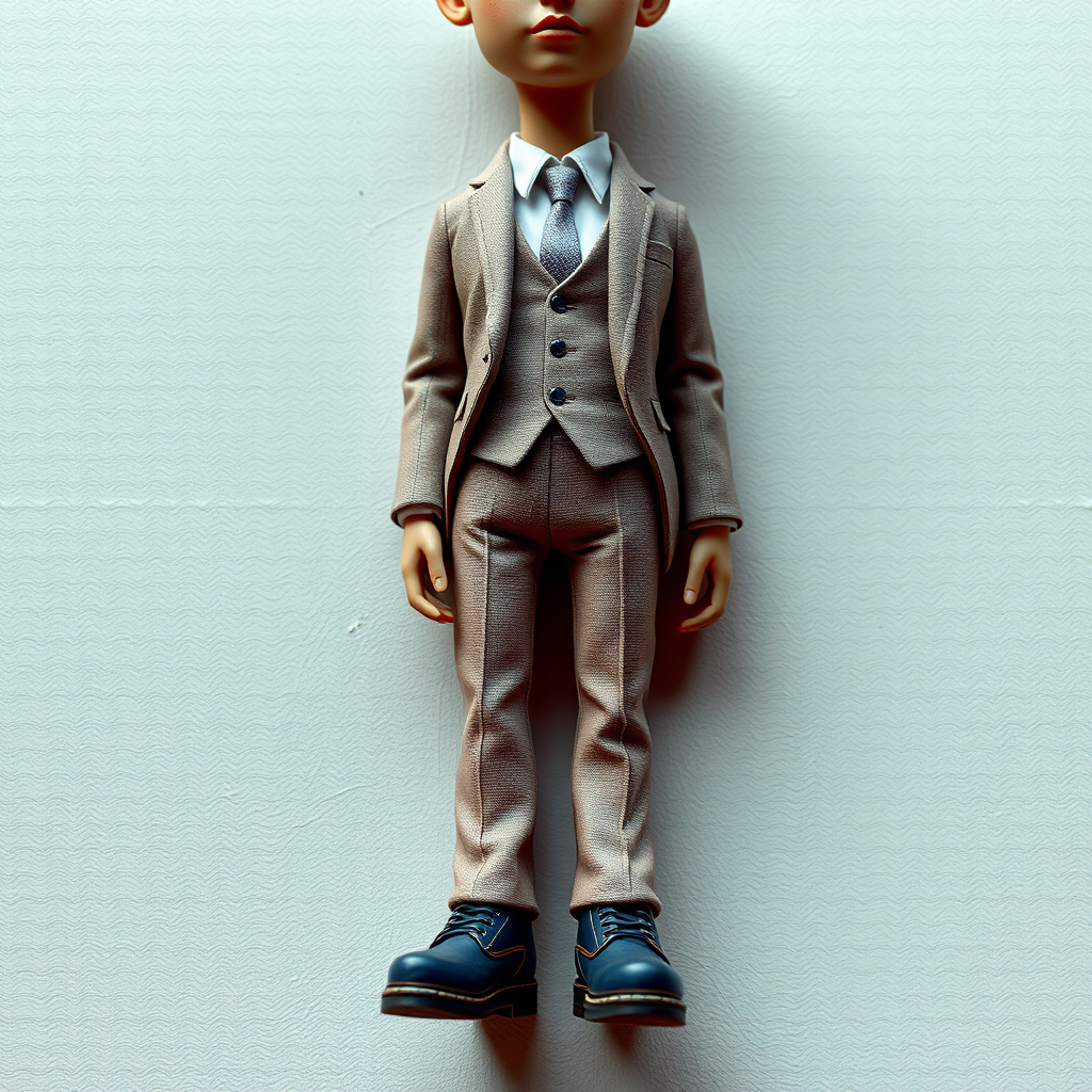 Every element of the artwork has been meticulously crafted, from the elegant lines of the tailored suit to the detailed stitching on the shoes. The attention to detail is exceptional, resulting in a mesmerizing masterpiece that inspires awe and admiration in all who behold it. CGI, 3D, doll, Octane, render, vivid texture, unexpected glitches, slightly cropped, imperfections, repeated patterns, unusual composition, extra details, experimentally mutated features, abstract elements, imaginative proportions, and surreal anatomy.