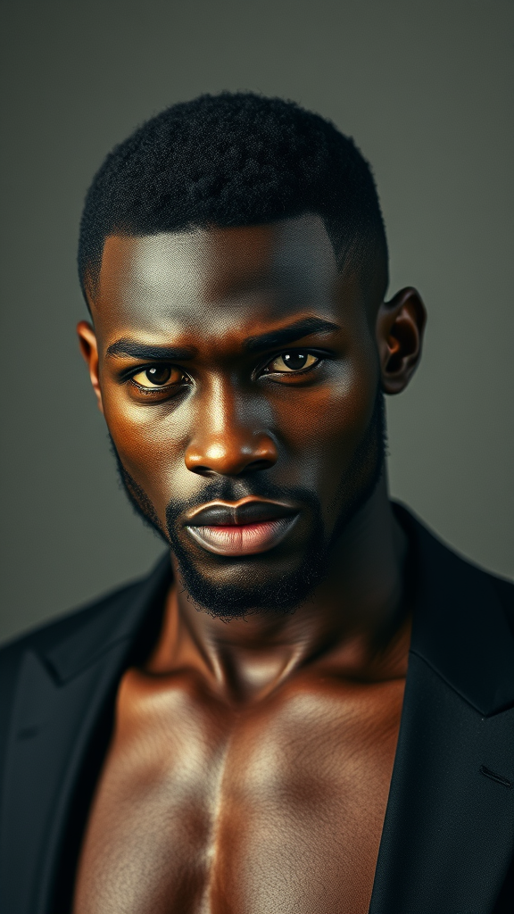 Exotic male, intense expression, African American, ideal masculine physique, hyper-realistic, high definition, sophisticated fashion sense, professional studio lighting, cinematic clarity, captured with 70mm finesse, reminiscent of John Collier's artistic style with subtle modern twists.