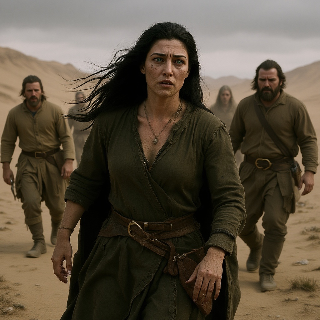 In a desolate expanse reminiscent of Tolkien's landscapes, a woman with raven-black hair and striking green eyes trudges through the ashen wasteland. Her face is smudged with dirt, and her tattered garments flap in the biting wind. Recently escaped from a shadowy prison, she moves with a mixture of desperation and determination. Around her, others in similarly ragged attire stagger forward, their eyes hollow and haunted like the Hillmen of old. The air is heavy, and the sky hangs low, casting a pallid light over the terrain that echoes with the whispers of ancient stories.