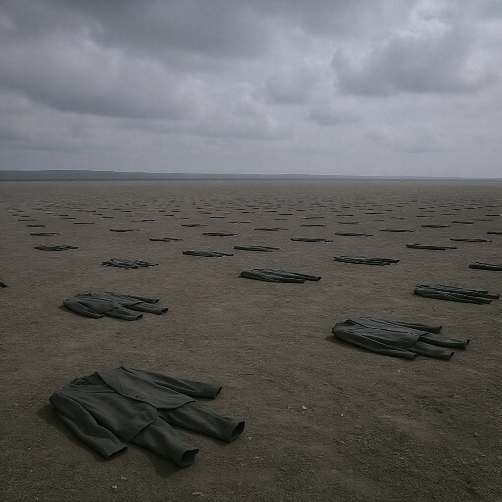 A desolate expanse stretches out, devoid of life, where only empty suits lie scattered, lined up in a solitary horizontal formation under the expansive sky.