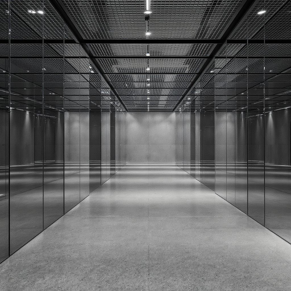 Expansive space with sleek mirrors and intricate metalwork, featuring minimalist monochromes and a structured grid layout, emphasizing post-processed aesthetics with clean lines, using a palette of dark silver and white. The design employs concrete elements, suitable for an architectural competition, focusing on personal expression and realism in lighting, maintaining a 9:16 aspect ratio with a raw and authentic style in version 6, while incorporating subtle creative nuances to enhance the core concept.