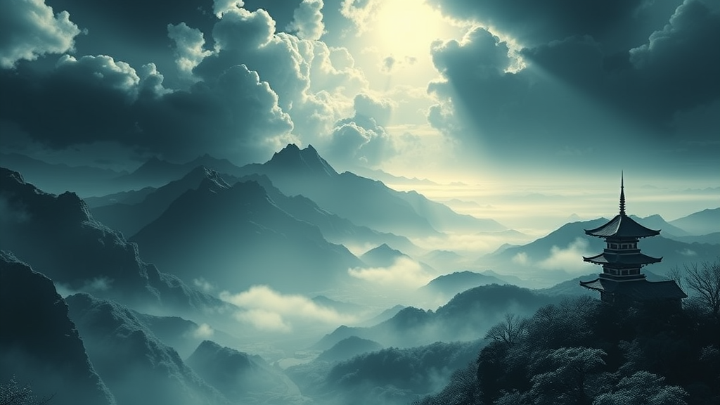 Expansive vista of a breathtaking Japanese landscape, reimagined in an evocative Kingdom Hearts ink aesthetic, featuring striking contrasts and atmospheric shadows, rendered in ultra-high-definition 8k.