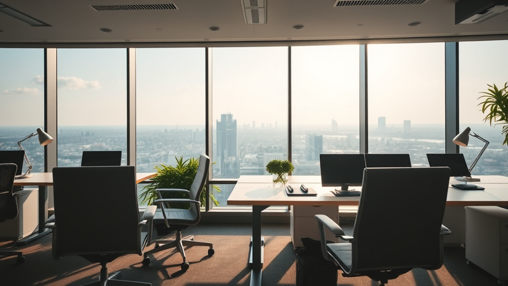 Expansive workplace showcasing a panoramic view, equipped with sleek Herman Miller Aeron chairs and elegant Artemide Tolomeo desk lamps, captured using a Canon EOS R5 with a 50mm f/1.2 lens, featuring a harmonious blend of natural sunlight and subtle LED illumination, complemented by a touch of greenery for a refreshing ambiance.