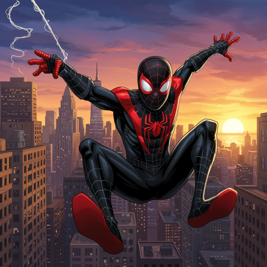 Experience the dynamic world of Spider-Man through an electrifying depiction of Miles Morales. In this high-detail comic art render, Miles swings through the vibrant cityscape, his iconic black and red suit glistening against the urban backdrop. The artwork captures the essence of agility and heroism, as the sun sets, casting dramatic shadows that enhance the scene's depth. The elongated 9:16 aspect ratio emphasizes the towering city buildings and adds an immersive sense of height to Miles' exhilarating journey through the city.