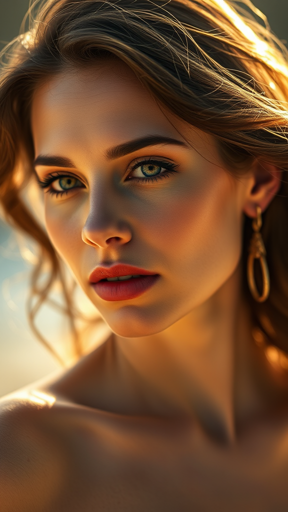 Experience the marvel of contemporary photography with this intimate portrait of a stunning woman, captured in exquisite detail by the Sony A7R IV. Its 61-megapixel full-frame sensor unveils every nuance of beauty. The portrait takes advantage of a Sony FE 85mm f/1.4 GM lens to produce a striking depth of field, highlighted by a lush, creamy bokeh. With precise settings of ISO 100, a shutter speed of 1/250, and an aperture of f/1.4, the image features perfectly balanced lighting and remarkable detail. This ultra-high-resolution portrait stands as a magnificent tribute to photography's artistry and the enduring elegance of its subject, enhanced by golden sun rays and soft reflections.
