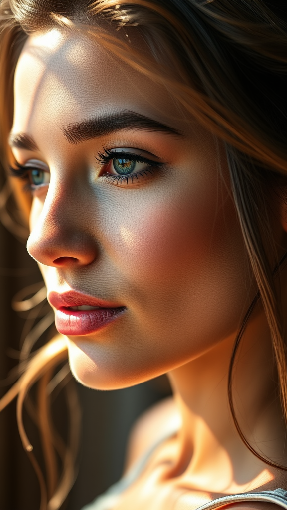 Experience the marvel of modern photography through an intimate close-up portrait of a stunning woman. Captured with the Sony A7R IV, the 61-megapixel full-frame sensor delivers extraordinary detail. Paired with a Sony FE 85mm f/1.4 GM lens, the composition achieves a rich, creamy bokeh effect that enhances the subject's allure. With settings adjusted to ISO 100, shutter speed 1/250, and an aperture of f/1.4, the lighting is impeccably balanced, highlighting the intricate textures and features of the portrait. This ultra-high-resolution image stands as a breathtaking tribute to both the art of photography and the enduring beauty of its subject, with sun rays and reflections adding depth and warmth to the scene.