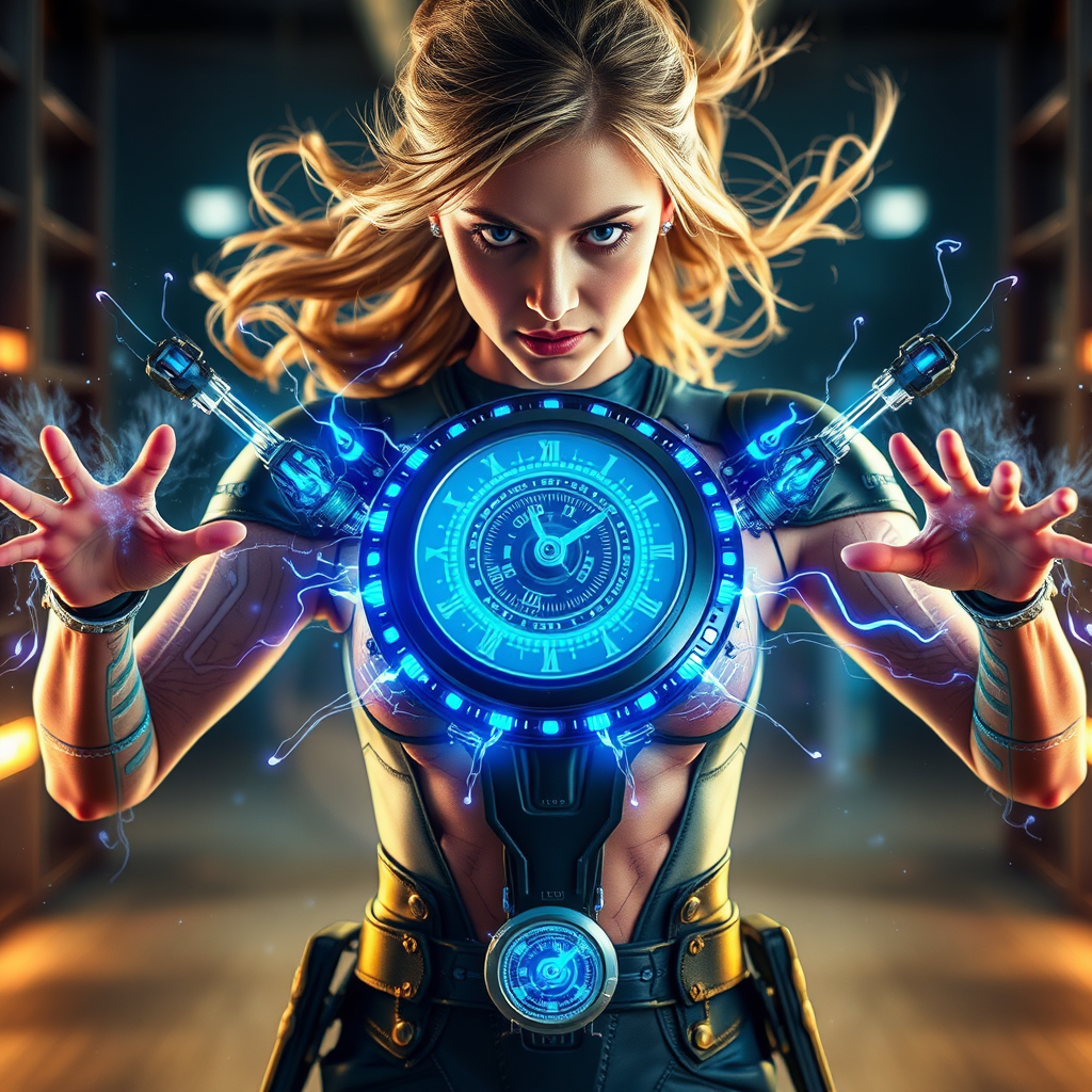 Experience the thrilling spectacle of an action-packed scene featuring a dynamic and realistic portrayal of a British heroine gifted with time-bending abilities. She is empowered by her Chronal Accelerator, a central circular device pulsating with vibrant blue energy and intricate circuitry on her chest, allowing her to seamlessly blink, recall, and manipulate time. The photo captures the intensity of the moment with an artistic twist—a deliberately imperfect depiction, showcasing abstract anatomy and distorted limbs, adding a unique, dreamlike blur to the imagery while maintaining the essence of her extraordinary powers.