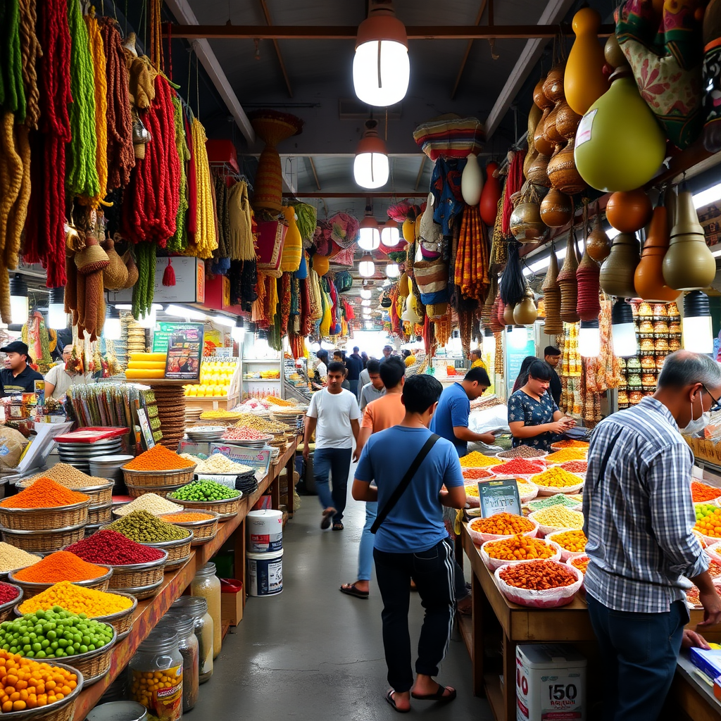 Experience the vibrant cacophony of a bustling marketplace where colorful stalls overflow with exotic spices, fresh fruits, and handmade crafts, each exuding its own story and inviting exploration amidst the lively banter of vendors and the sweet aroma of street food.